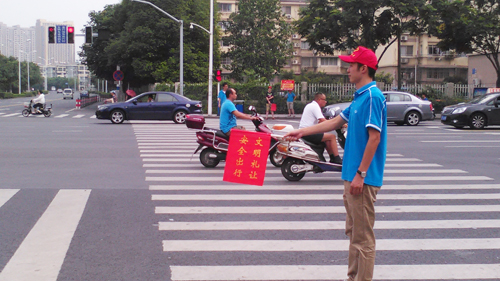 名职工志愿者参加我市“文明交通周周行”路口劝导执勤活动,宣传文明行车规范,引导市民树立良好风尚,提升城市文明形象。