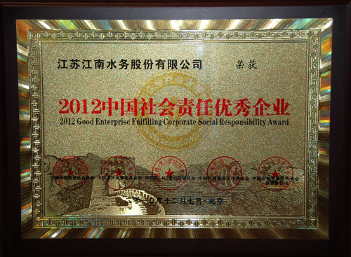 12月7日,2012中国企业社会责任年会在北京召开,在会上发布的“2012(第四届)中国企业社会责任榜”中,公司凭借在履行社会责任方面的优秀表现,获得了“社会责任优秀企业”的荣誉称号。责任指数评估得分为78.66分,在上榜的80个企业中排名第41,是唯一获得此奖项的水务企业。