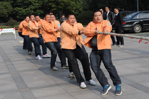 下午2:00,拔河比赛正式开始,队员们个个精神抖擞,裁判员一声:“预备——”队员们在场地上,双手紧握麻绳,迈开马步,时刻准备着。哨声一响,队员们就进入了紧张的状态。赛场上的男队员个个是猛将,拼尽全力,虽然不是寒冷的天气也把他们憋得面红耳赤,青筋凸出。最精彩的要数澄常和青阳男子5人组的比赛,去年就是他们两支队伍争夺冠亚军,不分上下的水平,今年会是谁赢呢?澄常队站第一位的小伙子给人印象尤为深刻,他边吼着边带领队伍轻松地拿下了第一局。这时青阳队的队员们没有放弃,在交换场地时一边深呼吸一边调整着状态,有的在活动手脚,有的在卷衣袖管,有的在系紧鞋带。第二局一开始,那麻绳中间的红色线球,就一会儿向左、一会儿向右,双方势均力敌、僵持不下,空气中充斥着紧张的气氛,两队队员咬紧牙关,生怕稍有松懈就会输了这局。看着红线球在中线两边摇摆不定,啦啦队也来了劲,大声喊着“加油!加油!”赛场上剑拔弩张,赛场下却早已没有了部门之分,大家都卯足了劲为赛场上的队员们呐喊助威,双方持续了一段时间后,青阳队靠持久战赢得了第二局。第三局是决胜局,究竟花落谁家呢?“嘟——”哨声响起,麻绳立马绷得紧紧的,这回澄常队的带头小伙大声吼着节拍,后面的队员密切配合,一举拿下了第三局,战胜了去年的冠军。