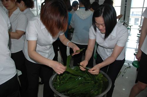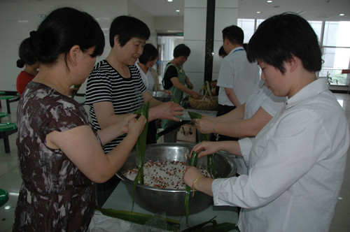 包粽子可是门技术活,别看他人三下两下就包好一个,没什么难度,真到自己动手才发现,单单把米包进粽叶不散就不容易,更别说包得有棱有角了。为了让大家快速学会包粽子,公司请来几位老阿姨言传身教,你看,女员工围在桌边,仔细地向老阿姨学习讨教呢。