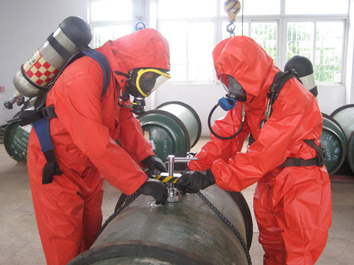 抢险人员迅速行动,穿好防护服,戴上防毒面具,熟练利用氨水寻找漏点,将压罩罩在泄漏的针阀上,用动夹头固定氯瓶保护圈……旋紧螺杆,压紧压罩,确保液氯处于密闭状态,抢险人员各司其职、紧张有序。 15分钟后,液氯泄漏应急处置完毕,演练顺利结束。