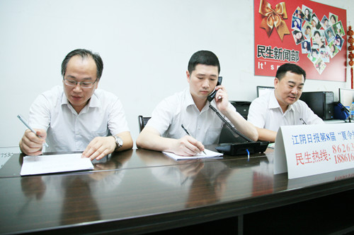 “我家的水龙头打开时,经常会有漏水现象”、“我家的水表转动时快时慢,不知是什么原因”、“江阴目前有几家水厂,应急处置的能力如何?”……7月15日下午,公司副总经理曾武及相关部门负责人来到江阴日报“夏令热线”接听市民热线,市民的咨询电话不断,大多是居民日常生活中遇到的一些问题。