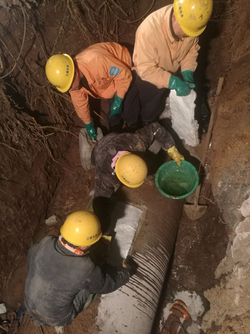 险情就是命令。抢修班组当即使用电锤凿开混凝土,发现玻璃钢管出现纵向裂缝,如不尽快修复,随时都有爆管的可能,局面将会进一步恶化。时间紧迫,抢修队争分夺秒抢进度,班长带头跳入水中,进入管沟作业。