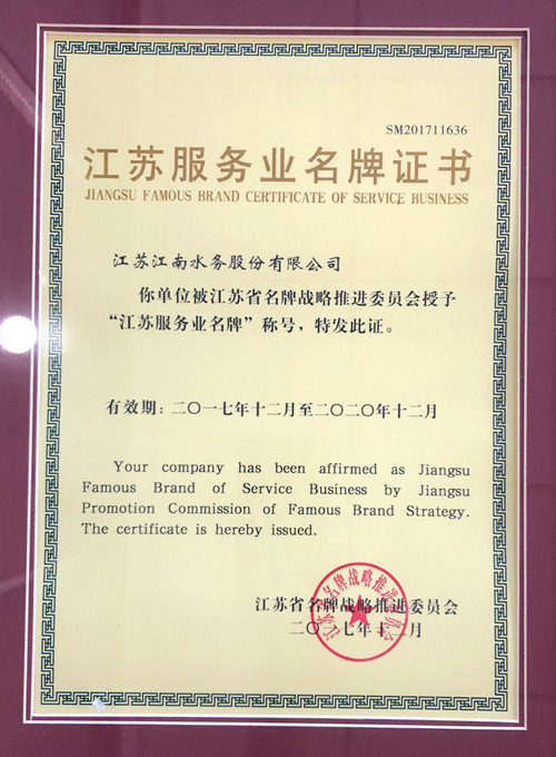 “江苏服务业名牌企业”是由江苏省名牌战略推进委员会颁发,分为江苏名牌产品、江苏服务业名牌企业、江苏区域名牌等奖项。“江苏名牌”也是我国名牌战略的重要组成部分,一直以来,其申报、评价工作以条件严、标准高、影响力大而著称,具有较强的信誉度。近年来,随着城市居民及工商业用水需求的不断丰富,供水行业出现了由生产型向服务型转型的趋势性变化。公司在向服务转型的背景下,以用户需求为导向,以质量为核心,以擦亮品牌为重点,运用过程管理方法,设计优化简洁高效的服务流程,剔除一切与满足用户需求无关的环节,聚焦价值链的建设,从而实现公司战略目标。2014年,在中国水网颁布的中国《100个城市供水服务满意度指数报告》中,江阴位居总体满意度第一位。2015年公司成为江苏省首家供水服务标准化单位,国家级供水服务标准化单位正在创建过程中。公司服务质量、水平稳步提升,获得市民好评。
